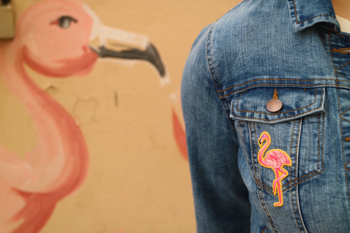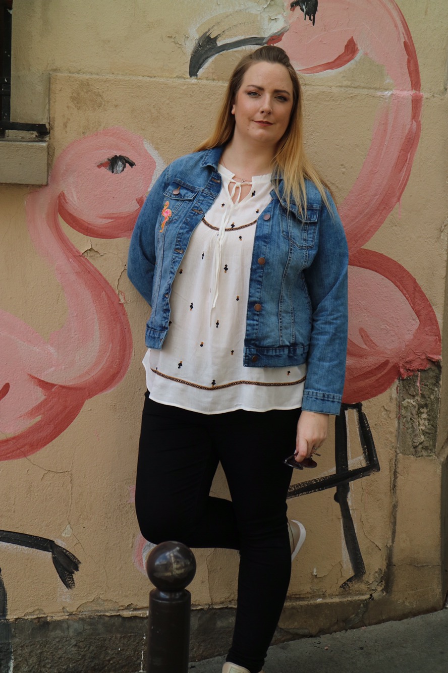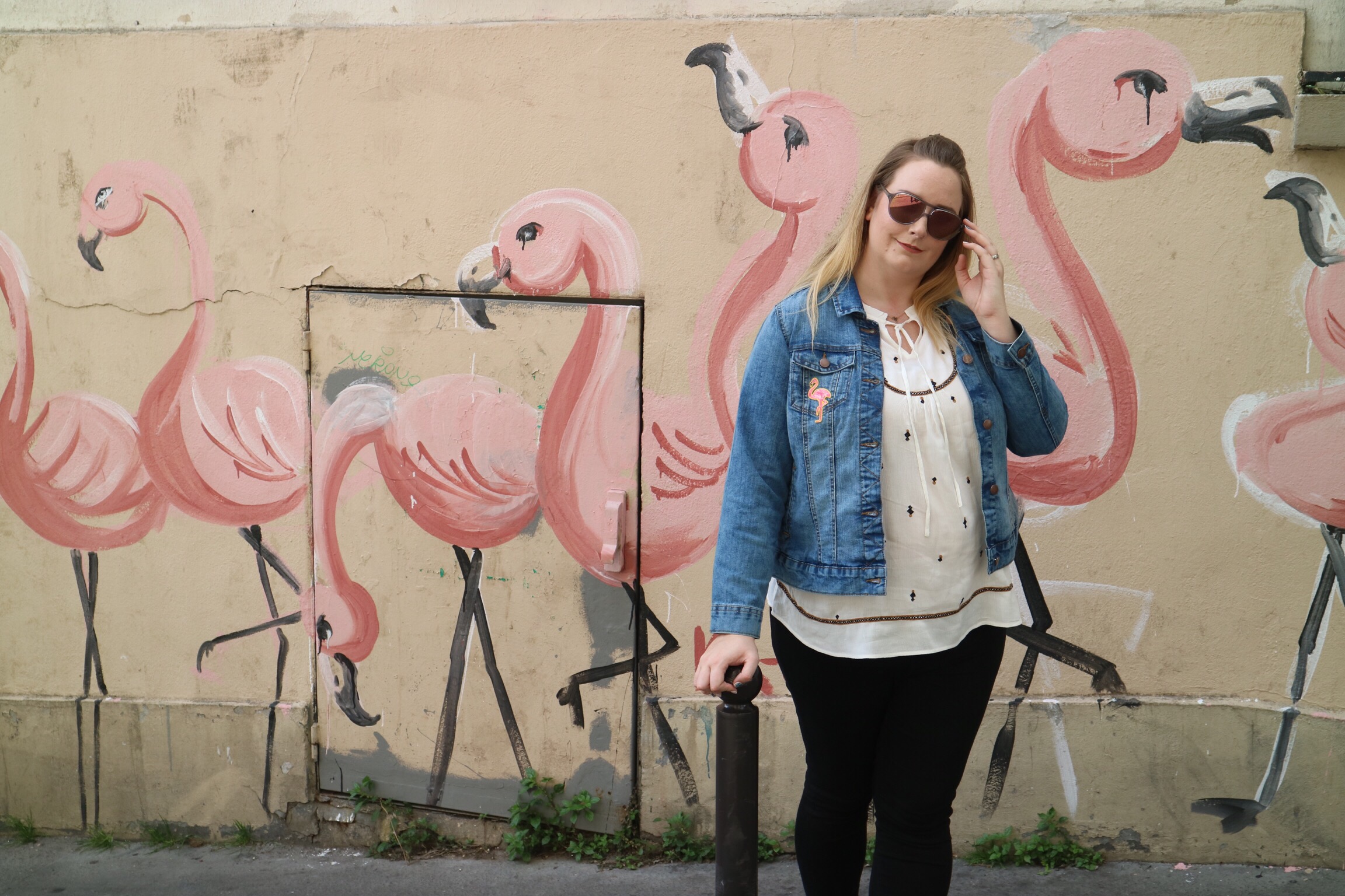 After posing there awe went on the hunt for the Flamingo Wall.  It was something I’d seen on  Instagram so a major stalk then happened to see where exactly it was. I’m talking google searches and google maps street views to track it down. (It’s not on street view either in case you were wondering!) This was the perfect location to shoot my Evans Denim jacket (£30) that I customised with the help of Hand and Lock at their denim event. The flamingo patch was born for it!