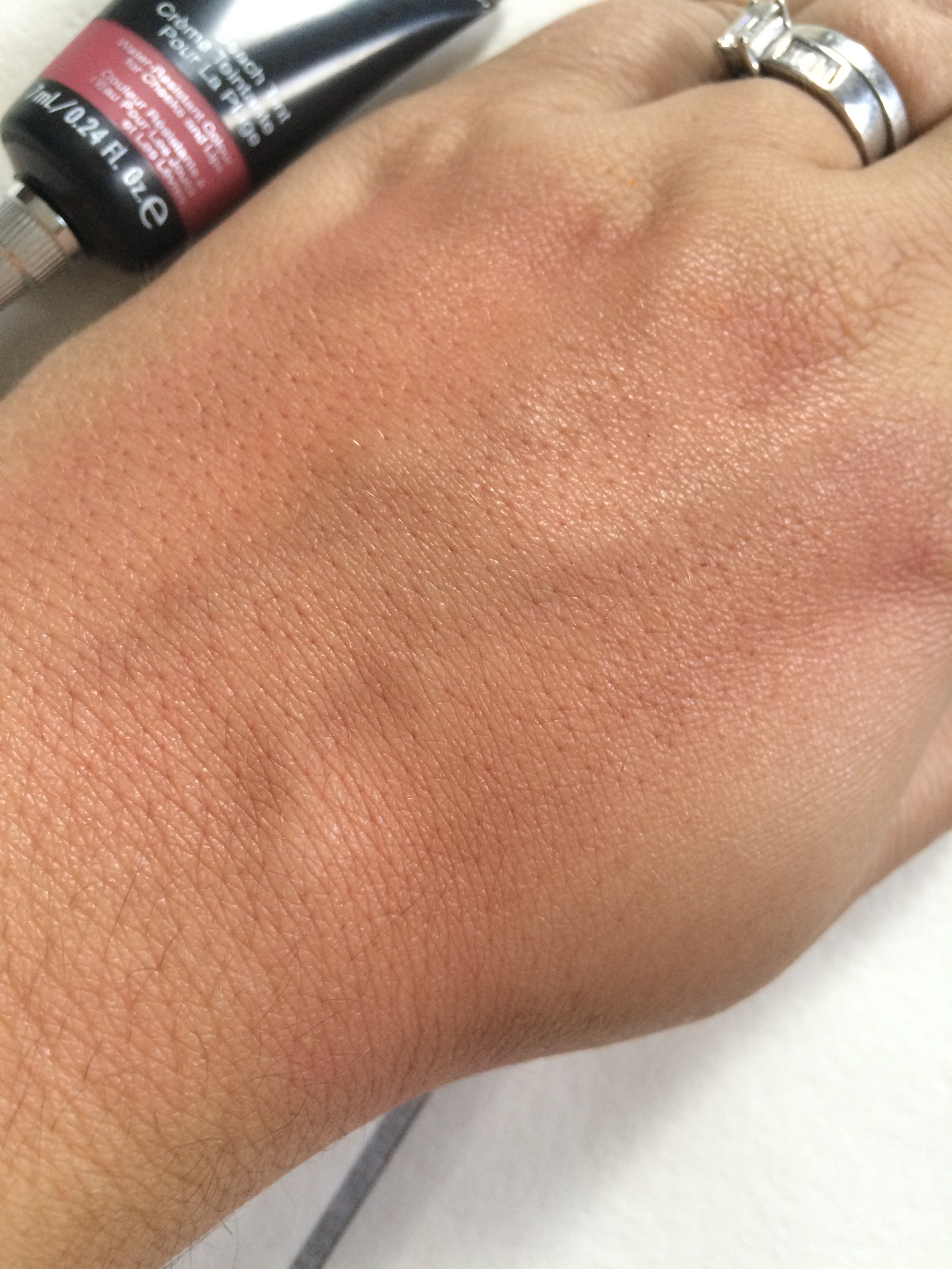 It is a subtle rose pink I would say with a very subtle shimmer that you can see on my hand but not do when applied. I love it. The only watch out is that due to its consistency it does need shaking before you squeeze product out. You can see in this pic it looks slightly separated and a good shake stops that.