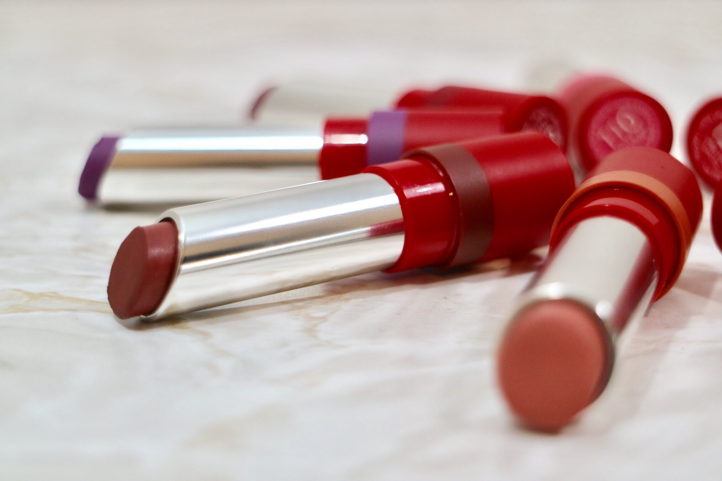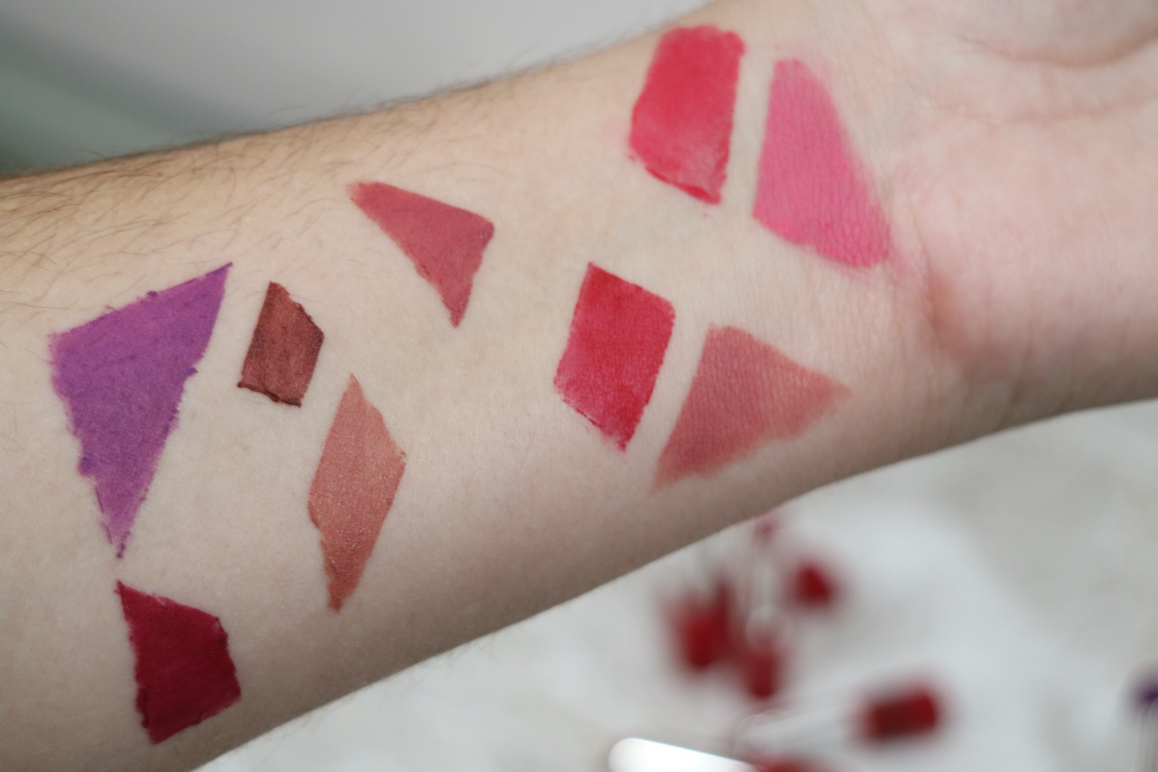Colour wise it was my perfect shade of nude, and colour payoff is good. There’s about 4 of the 9 shades that are nude/light pink and all of them have great colour payoff. It’s when I got to swatching the darker colours I found they needed to be applied more frequently and more of them applied in the first place to get a better finish. As I’m not a dark shades fan I can’t say I’ve tested these for longevity like I have the nude shades. You can kind of see it in the swatches below (running from left to right in the order of the photos below them).