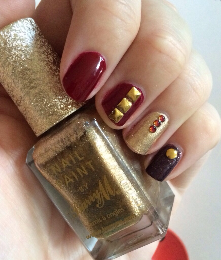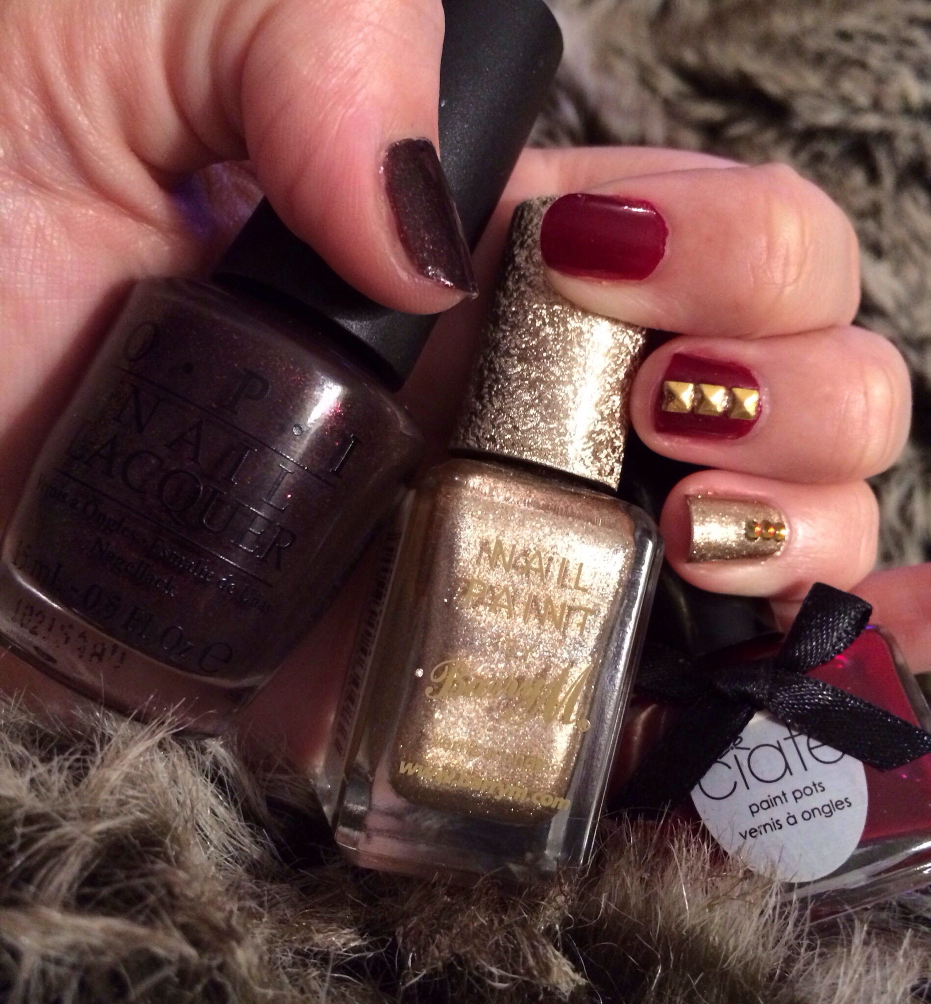 I had some real Swarovski crystals in volcano I thought I could use to represent the garnet and chose Barry M in gold (the 2012 Boots Christmas Edition) to contrast with them. I then chose a gold flecked deep burgundy from OPI in Tease-y Does It ( discontinued now) and a red burgundy from Ciate in Dangerous Affair £9.