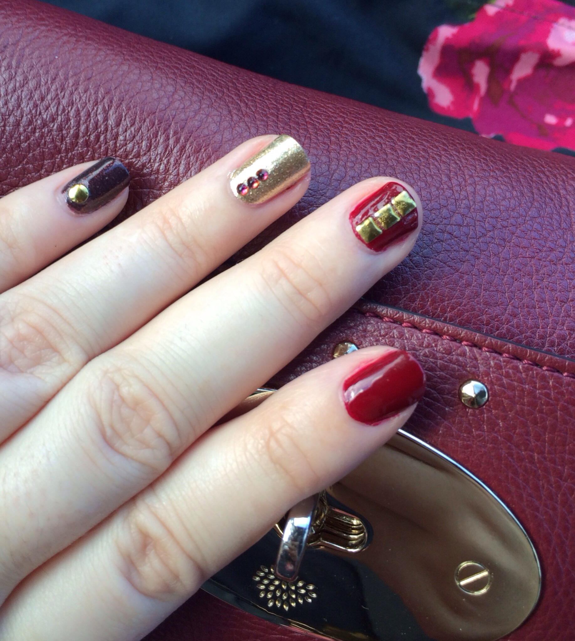 I added gold studs to match the gold (and my outfit today!) and some serious amounts of topcoat.