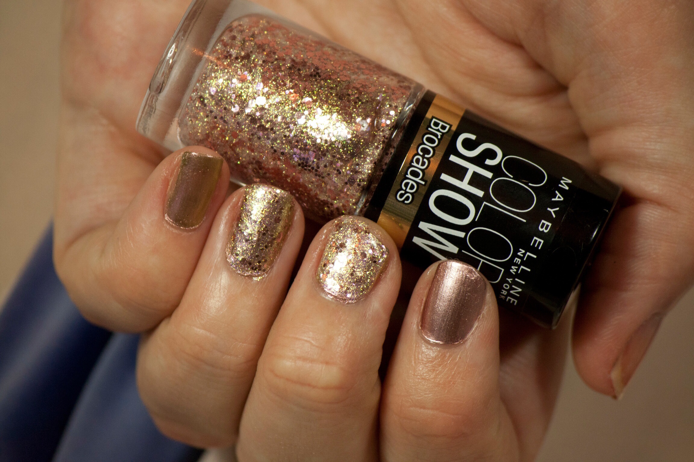 Maybelline Brocades in knitted gold is an exact dupe for Ciate Antique Brooch in the bottle and on the nail