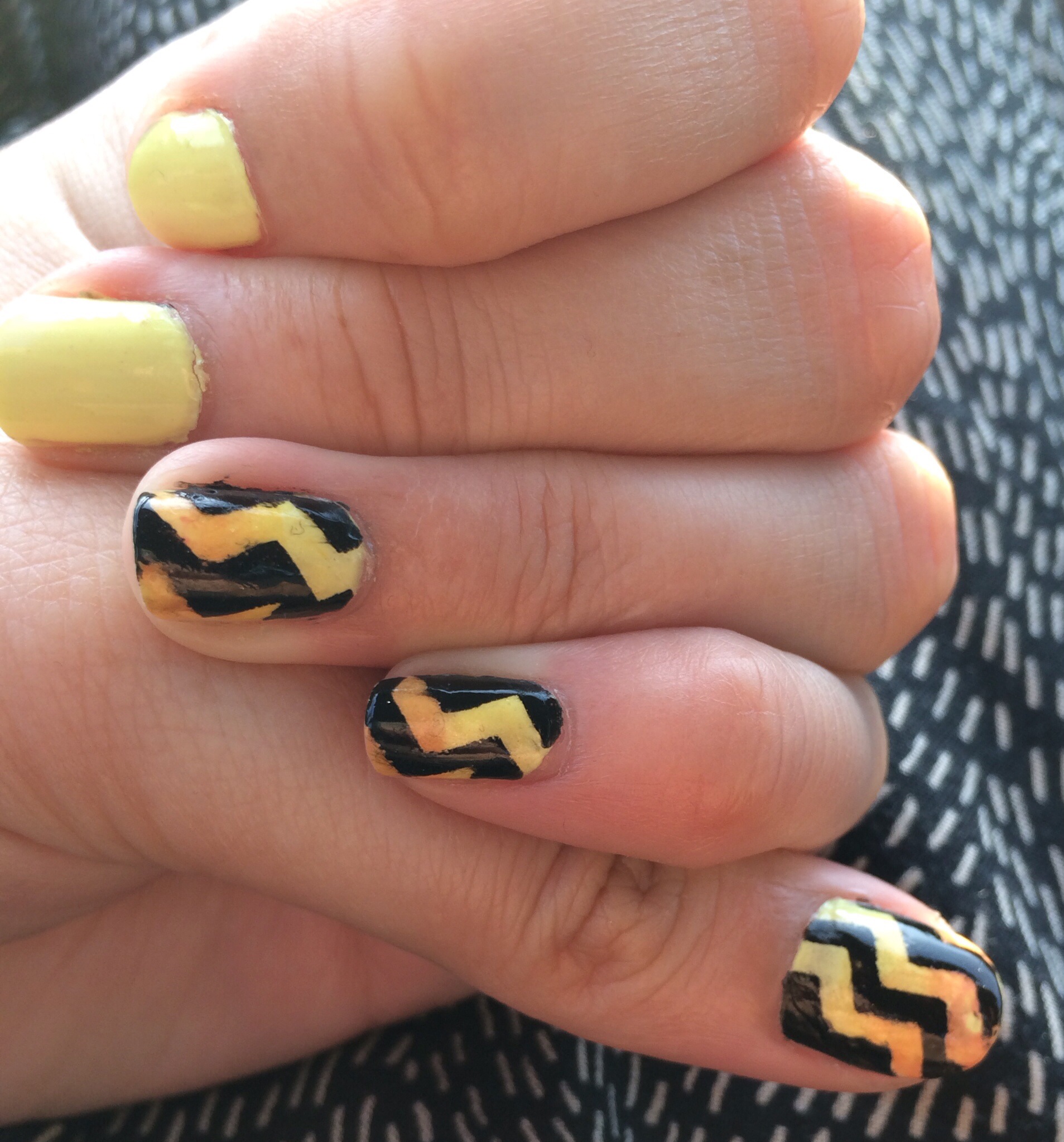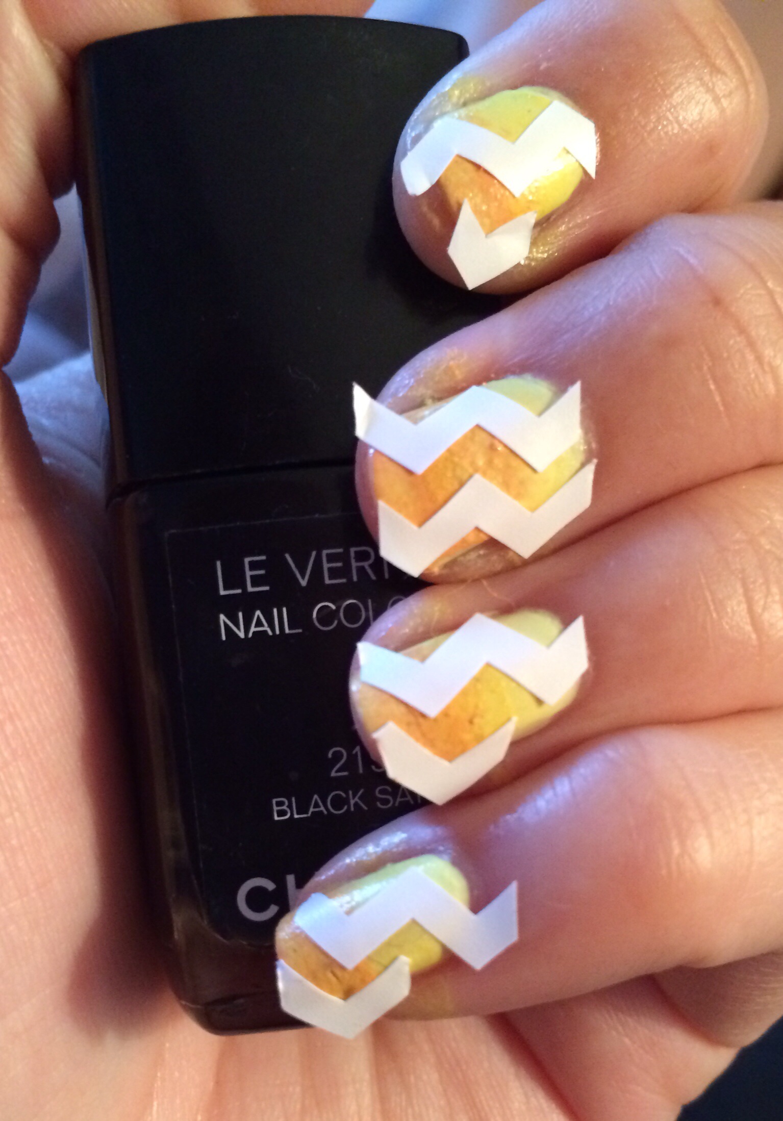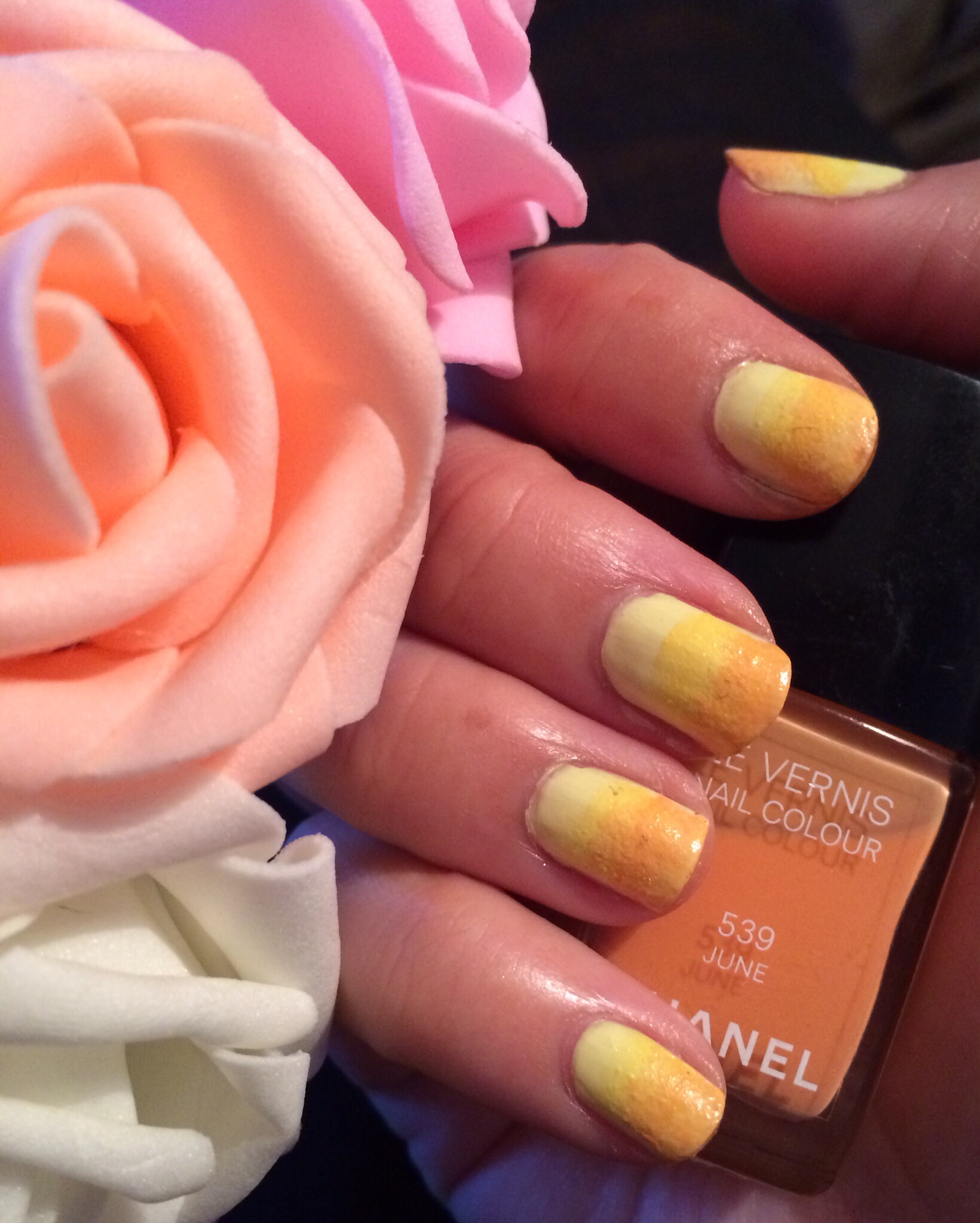 I then used a make up sponge to layer a peach and yellow polish on the top two thirds of my nails to create an ombré look.